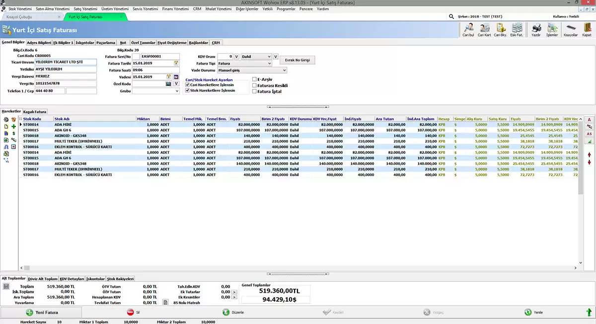 Çoklu kullanıcı desteği ile Cari, Cari2, Kasa, Stok, Stok2, Fatura, Çek-Senet, İrsaliye, Teklif, Sipariş, Döviz Takip, Döviz Bürosu, Depo, Lokasyon, Banka, Kartoteks (Barkod basımı), Pazarlama, Seri No-Garanti Takip, Taksit Takip, Seri Senet Basımı, Servis, Üretim, Bonus Sistemi, Tüp-Su Takip, MRPII,CRM, Zincir Pazarlama,İthalat modüllerini desteklemektedir.